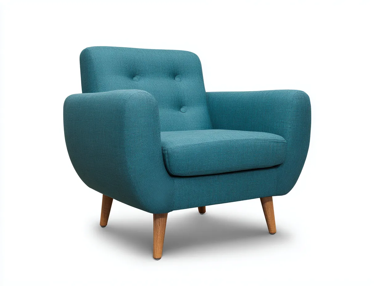 Le fauteuil est revêtu d'un tissu bleu-vert à la texture fine et uniforme, agréable au toucher. La structure repose sur des pieds en bois massif de teinte naturelle, offrant une base stable et un contraste chaleureux avec le revêtement textile.